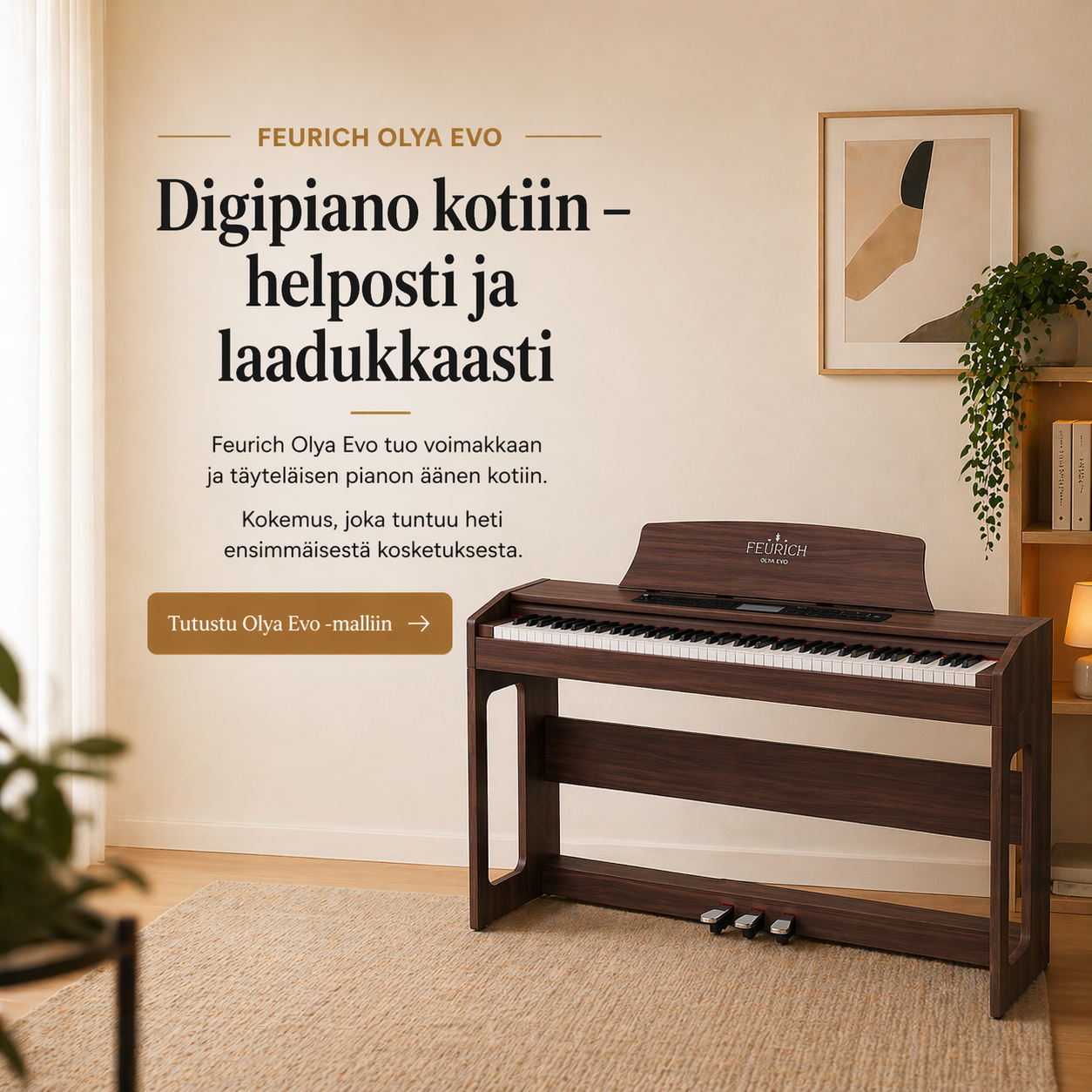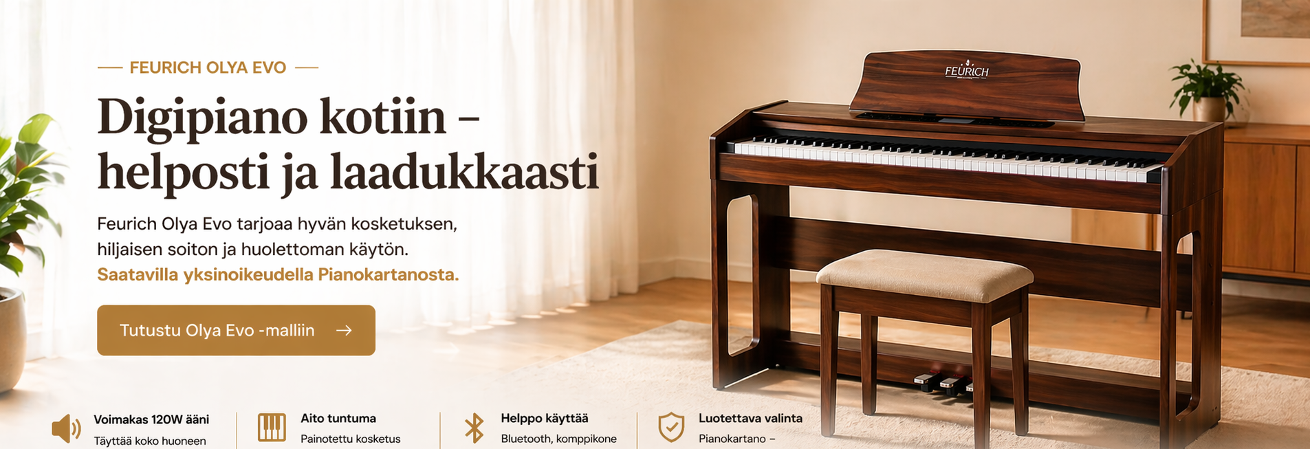 Tervetuloa Pianokartanoon, asiantuntevaan pianokauppaan, josta löydät Suomen laajimman valikoiman uusia ja käytettyjä soittimia. Edustamme huippumerkkejä, kuten Yamaha, Kawai ja Feurich.
